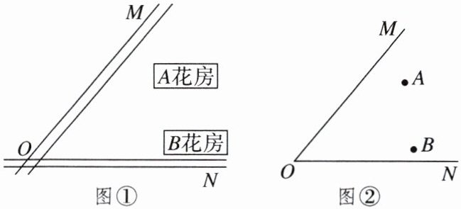 8.如图①,两条交叉马路$OM$,$ON中间区域建有A$,$B$两个温室花房.现要在两条马路$OM$,$ON之间的空场处建鲜花交易中心P$,使得交易中心$P到两条马路OM$,$ON$的距离相等,且到两个温室花房$A$,$B$的距离也相等.如何确定交易中心$P$的位置?如图②,利用尺规作图求作点$P$(不写作法,保留作图痕迹).