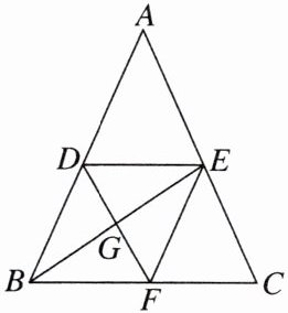 2. 如图,在△ABC中,AB= AC,点D,E分别为边AB,AC上的点,DE//BC,连接BE,点G为BE的中点,连接DG并延长,交边BC于点F.