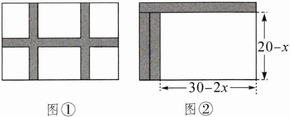 例 为响应市委市政府提出的建设“绿色襄阳”的号召,我市某单位准备将院内一块长为30m,宽为20m的长方形空地建成一个矩形花园。要求在花园中修两条纵向平行和一条横向的小道,剩余的地方种植花草,如图①所示。如果要使种植花草的面积为$532m^2,$那么小道的宽度应为多少?(注:所有小道的宽度相等)