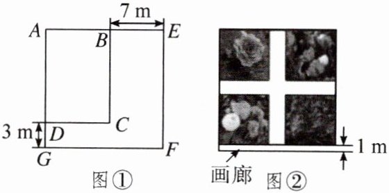 (2)在实际建造时,从校园美观和实用的角度考虑,按图②的方式进行改造,先在图②中所得正方形区域内的一侧建成1m宽的画廊,再在余下地方建成宽度相等的两条垂直小道后,其余地方栽种鲜花。如果栽种鲜花区域的面积为$90m^2,$求小道的宽度。