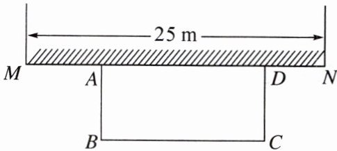 设 $ AB = x $ m,则 $ BC = (50 - 2x) $ m。根据题意可得 $ x(50 - 2x) = 300 $,解得 $ x_1 = 10 $,$ x_2 = 15 $。当 $ x = 10 $ 时,$ BC = 50 - 2×10 = 30(m) > 25m $,故 $ x_1 = 10 $ 不合题意,舍去;当 $ x = 15 $ 时,$ BC = 50 - 2×15 = 20(m) < 25m $,符合题意。