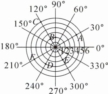 4. 如图,雷达探测器测得六个目标A,B,C,D,E,F出现,按照规定的目标表示方法,目标A,E的位置分别表示为A(5,30°),E(3,300°),则目标C的位置表示为______。