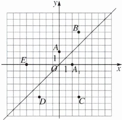 (1)由图观察可知点$A(0,2)与点A_1(2,0)关于直线y= x$对称,请你在图中标明点$B(3,5)$,$C(3,-5)$,$D(-3,-5)$,$E(-5,0)关于直线y= x的对称点B_1$,$C_1$,$D_1$,$E_1$的位置,并写出它们的坐标;