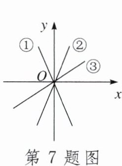 7. 如图,三个正比例函数的图象分别对应表达式:①$y = ax$,②$y = bx$,③$y = cx$,将$a,b,c$从小到大排列并用“$<$”连接为______.