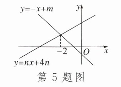 5. 如图,直线$y = -x + m与y = nx + 4n(n \neq 0)的交点的横坐标为-2$,则关于$x的不等式组-x + m > nx + 4n > 0$的整数解为()