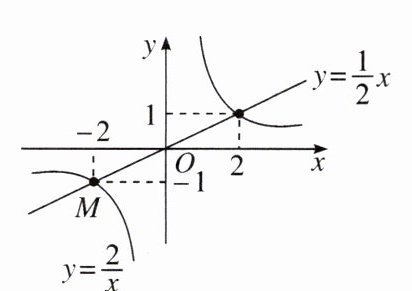 设正比例函数、反比例函数的表达式分别为$y=k_1x$,$y=\frac{k_2}{x}$,其中$k_1$,$k_2$为常数,且均不为零。将点$M(-2,-1)$分别代入表达式,得$-1=k_1\cdot(-2)$,$-1=\frac{k_2}{-2}$,解得$k_1=\frac{1}{2}$,$k_2=2$。因此,这两个函数表达式分别为$y=\frac{1}{2}x$和$y=\frac{2}{x}$,它们的函数图象如图所示。
