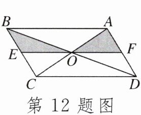12.如图,在▱ABCD中,AC,BD相交于点O,E为BC的中点,延长EO交AD于点F.若$S_{//ogram ABCD}= 32cm^{2}$,则阴影部分的面积为____.