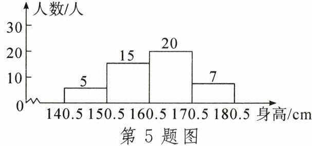 5. 某校测量了八(1)班学生的身高(精确到1cm),按10cm为一段进行分组,得到如图所示的频数直方图,则下列说法中正确的是 ()