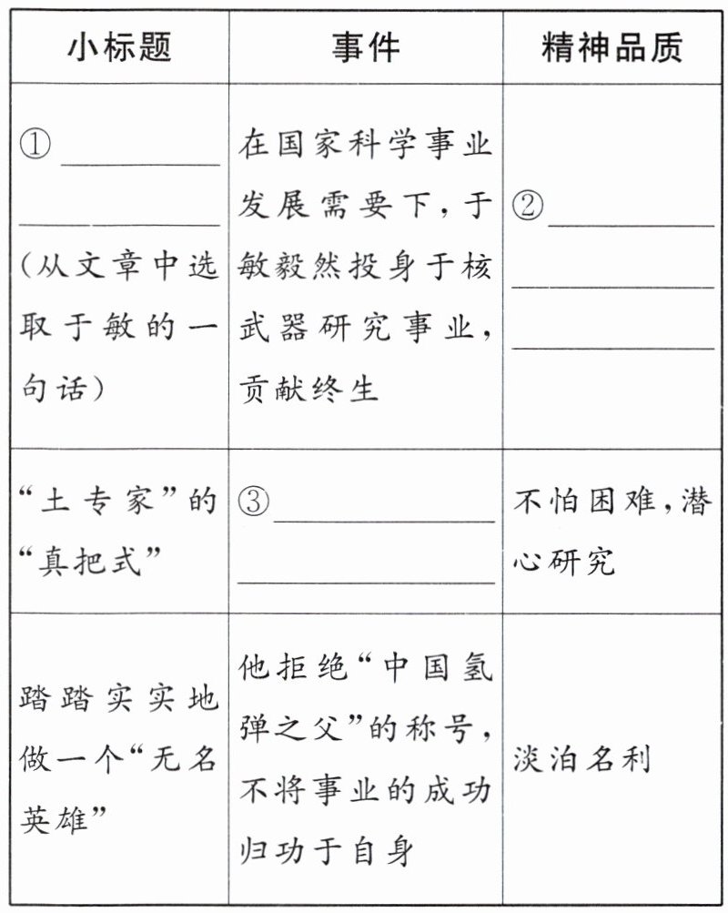 ①“我不能有另一种选择” ②热爱祖国 ③于敏和同事们找到突破氢弹的技术途径,氢弹原理试验取得圆满成功