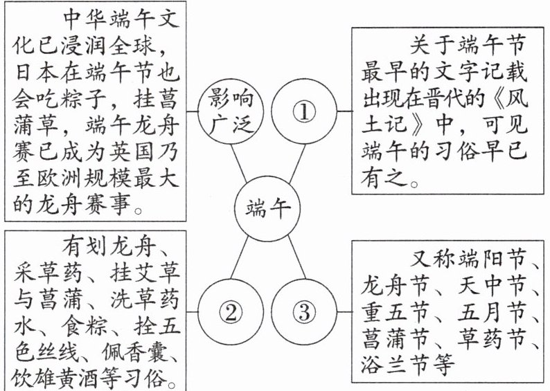 3. 为更好地了解传统节日,同学们搜集了关于各个传统节日的一些资料做成思维导图,下面是端午节资料,请你帮忙用四字短语补全下面的思维导图。(3分)