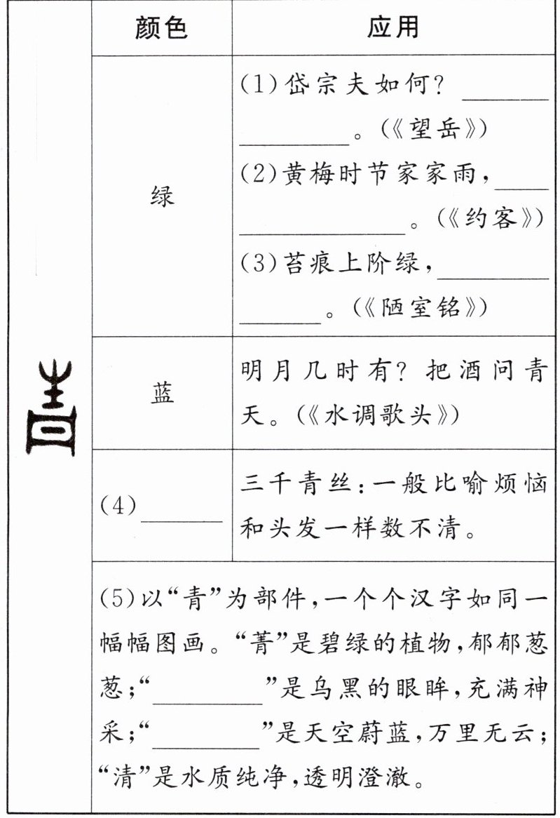 2. 古人眼中,“青”颜色丰富。请将下面的色卡补充完整。(6分)