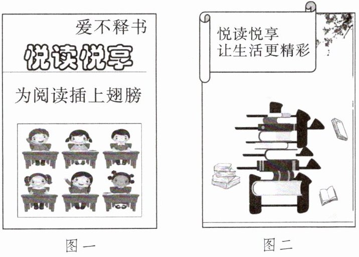 @@示例一:图一 图中呈现“悦读悦享”“为阅读插上翅膀”字样,主题突出醒目。右上角“爱不释书”化用成语“爱不释手”,能激发同学们的读书兴趣。下面的画面呈现了同学们专心阅读、积极分享的情境,很好地诠释了活动主题。示例二:图二 画面主体部分用各类书本组合勾勒出繁体字“书”,左上角以古书卷轴展开,文化气息浓厚。卷轴内“悦读悦享 让生活更精彩”点明活动主题及意义。右上角一簇枝叶垂下,生机盎然,寓意悦读悦享造就生机勃勃、精彩纷呈的人生。(意对即可)