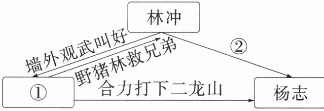 5. 《水浒传》中有三个好汉起初是两两相识,直到落草为寇才结成了“铁三角”般的关系。请你根据下面这个关系图,判断①②处应该填入的内容。(2分)