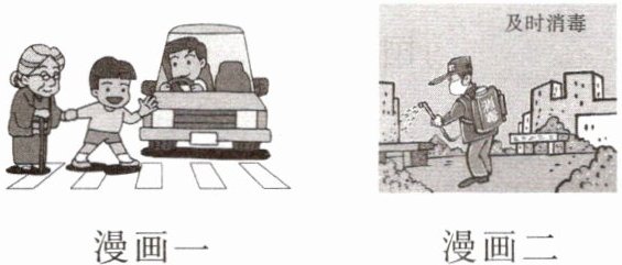 (1)问,漫画一启示我们要承担关爱他人的责任。漫画二中的社区工作者对社区的公共环境及时开展预防性消毒工作,这启示我们要承担服务社会的责任。根据上述分析,按照题目要求,完成答题即可。第