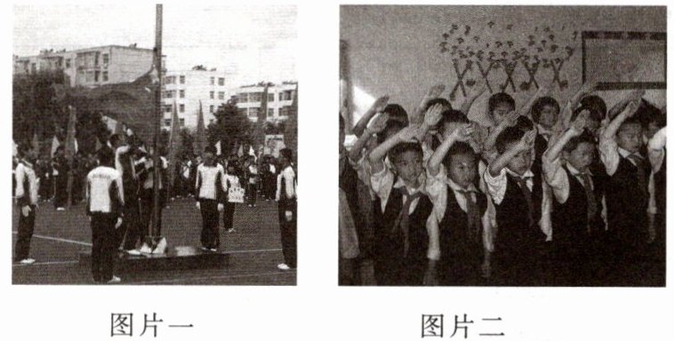 (1)图片一:升旗仪式。图片二:行少先队队礼。
