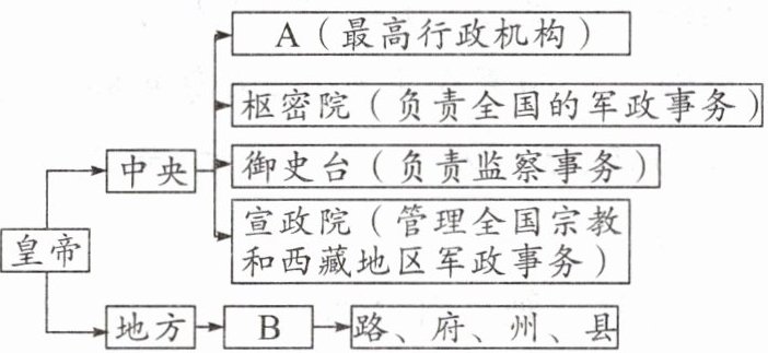 (2)材料二图中A代表的是哪一行政机构?结合所学知识指出图中B代表的行政区划。(4分)