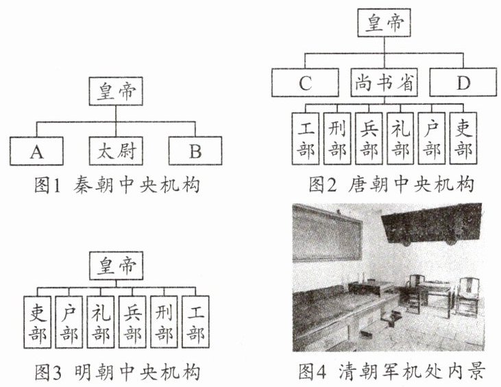 (1)A:丞相;B:御史大夫;C:中书省;D:门下省。废除丞相,提升六部职权,六部直接向皇帝负责。