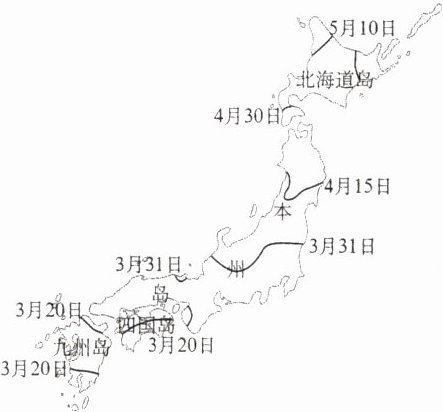 春天是日本人赏樱的季节,当第一朵樱花在九州岛南部绽放后,媒体就开始向人们播报樱花开放的时间(下图)。据图回答第1、2题。