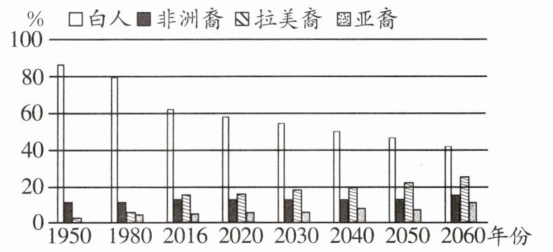 读“美国各人种所占比例趋势图”,完成1~2题。