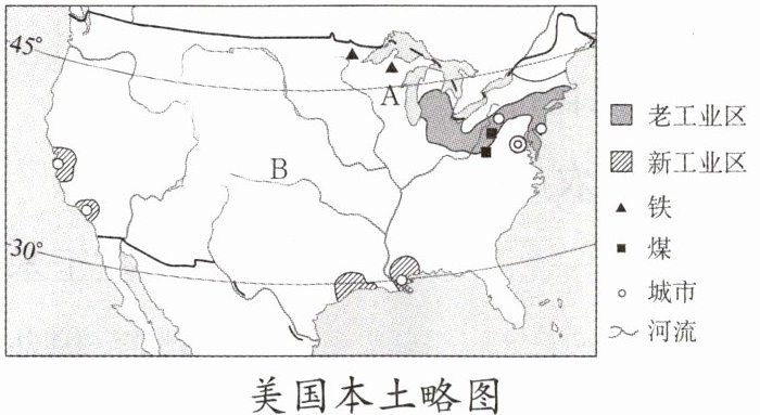 4. 根据图中信息,请列举两例说明美国老工业区兴起的自然地理条件。(请从资源、地形、水源、海陆位置等方面作答)
