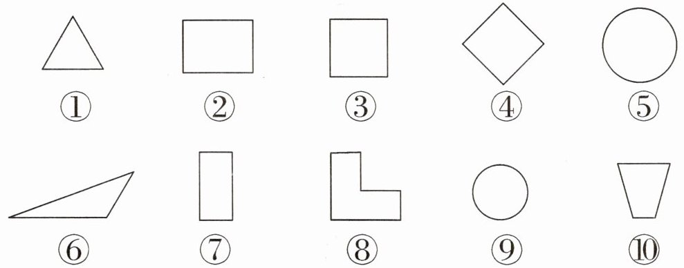 图中有()个三角形、()个正方形、()个长方形和()个圆。