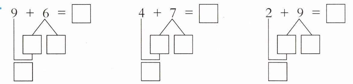 【解析】: 对于$9 + 6$:把$6$分成$1$和$5$,先算$9 + 1 = 10$,再算$10 + 5 = 15$。