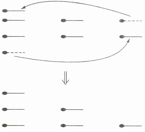 解析:把第三排的1根移到第二排,这样第二排变成了3根,而第三排没有了,第二排就成了第三排。再从第一排中移1根到最上面。(或将第一排2根火棒移到第三排中。)