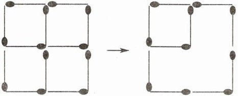 解析:原来12根火柴棒,拿走2根后剩下10根,不可能拼成两个大小相同的正方形,只能是一个大一个小。因此,只要保留原来外面的大正方形,拿去里面的2根,使里面的4个小正方形变成1个就可以了。