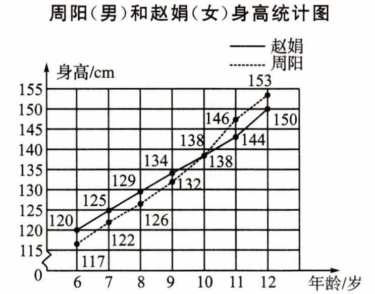 2. 在 10 岁之前,周阳的身高一直都比赵娟()近 3 厘米,到()岁后,周阳的身高就开始超过赵娟,()岁时,周阳反而比赵娟高了 3 厘米。
