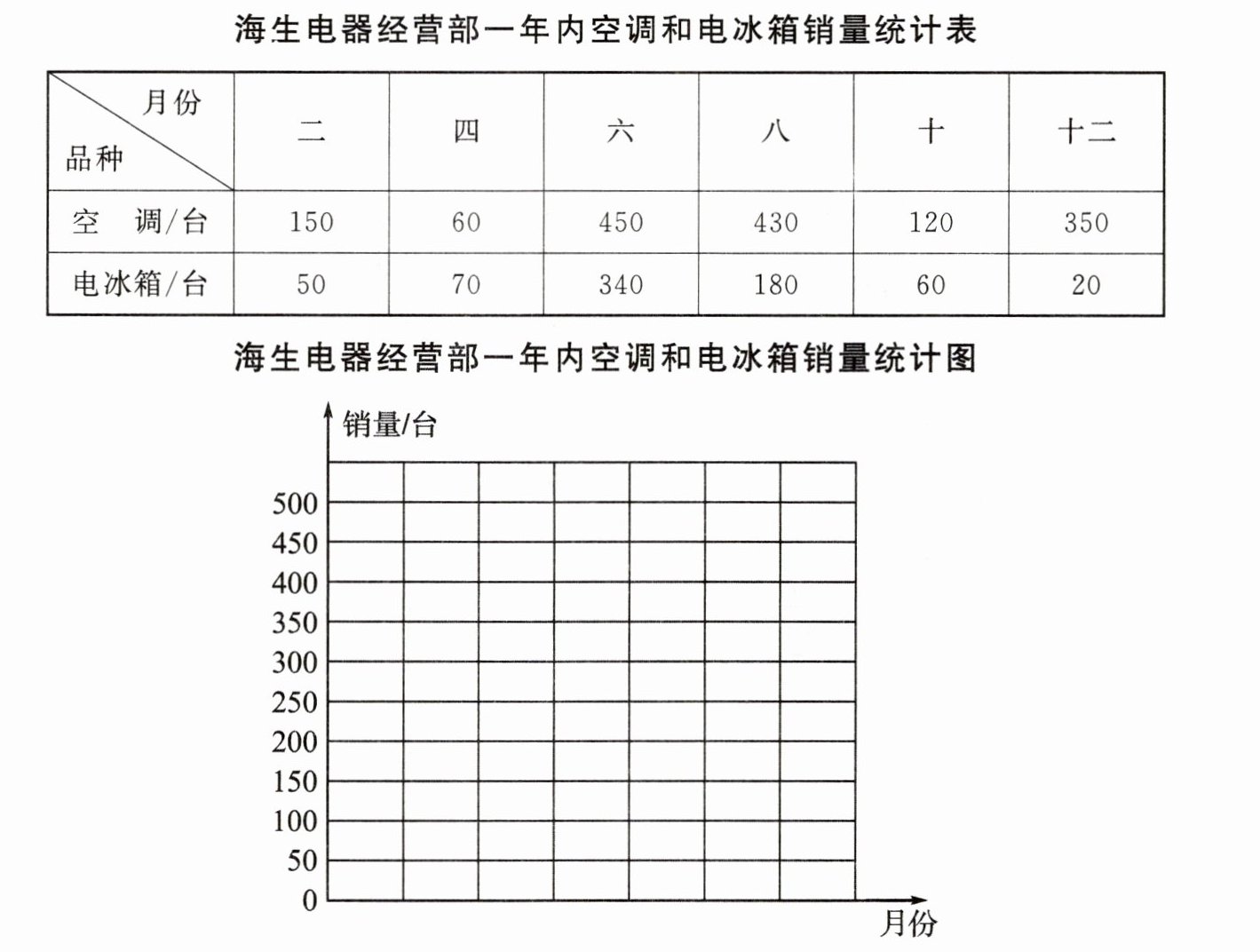 【答案】:按照上述方法绘制出空调和电冰箱销量的折线统计图。(由于无法直接绘制图形,你可根据数据自行准确绘制)