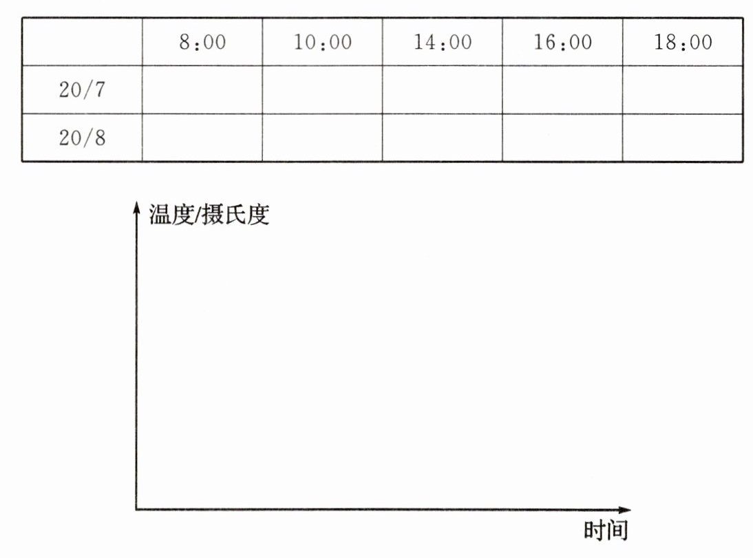 【答案】:由于实际测量数据未知,这里无法给出具体的表格填写内容和折线统计图。学生需亲自进行气温测量记录(例如假设7月20日8:00测量温度为26℃,10:00为28℃,14:00为32℃,16:00为30℃,18:00为28℃;8月20日8:00测量温度为25℃,10:00为27℃,14:00为31℃,16:00为29℃,18:00为27℃,这只是假设数据,实际要真实测量),再根据测量数据完成表格填写和折线统计图绘制。表格填写示例(假设数据):