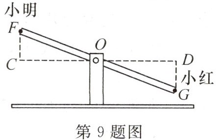 9. 新考向 真实情境 如图,小明与小红玩跷跷板游戏,支点$O$是跷跷板的中点,两人分别坐在跷跷板的两端(即$OF = OG$)。如果点$O$距地面的距离是$60 cm$,那么当小明从水平位置$CD$上升$15 cm$时,小红距地面的高度是
