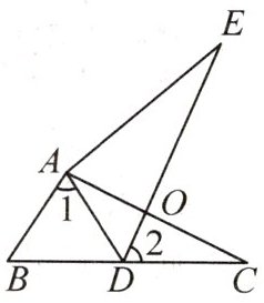 8. 如图,$\angle C = \angle E$,$AC = AE$,点$D$在边$BC$上,$\angle 1 = \angle 2$,$AC$和$DE$相交于点$O$。求证:$\triangle ABC\cong\triangle ADE$。