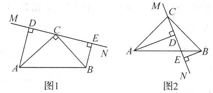 (2)当直线MN处在图2的位置时,直接写出DE,AD,BE之间的数量关系.