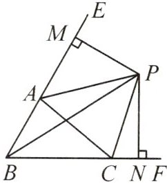 15. 如图,在$\triangle ABC$中,$\angle ABC$,$\angle EAC$的平分线 $BP$,$AP$ 交于点 $P$,延长 $BA$,$BC$,$PM\perp BE$,$PN\perp BF$,垂足分别为 $M$,$N$,则下列结论:①$CP$平分$\angle ACF$;②$\angle ABC + 2\angle APC = 180^{\circ}$;③$\angle ACB = 2\angle APB$;④$S_{\triangle PAC}=S_{\triangle MAP}+S_{\triangle NCP}$。其中正确的个数是(