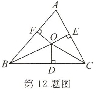 12. 如图,$O$ 是$\triangle ABC$内一点,且点 $O$ 到$\triangle ABC$三边 $AB$,$BC$,$CA$ 的距离 $OF = OD = OE$。若$\angle BAC = 80^{\circ}$,则$\angle BOC=$