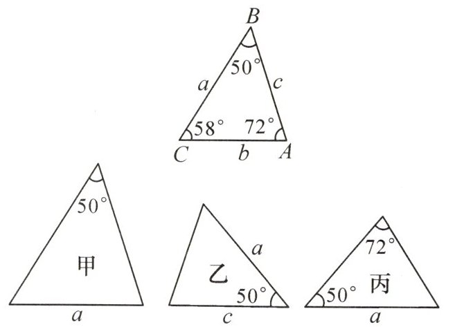 1. (2024·南充期末)下列各图中,$a$,$b$,$c$分别是三角形的边长,由甲、乙、丙三个三角形中标注的信息,能确定与$\triangle ABC$全等的是(