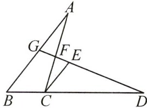 6. 如图,在$\triangle ABC$中,$D$是$BC$延长线上一点,满足$CD = AB$,过点$C$作$CE// AB$且$CE = BC$,连接$DE$并延长,分别交$AC$,$AB$于点$F$,$G$.