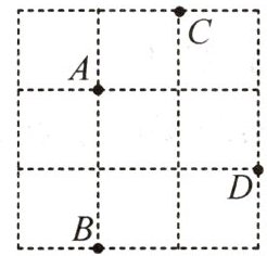 13. 如图,在 $ 3×3 $ 的正方形网格中有四个格点 $ A $,$ B $,$ C $,$ D $,以其中一个点为原点,网格线所在直线为坐标轴,建立平面直角坐标系,使其余三个点中存在两个点关于一条坐标轴对称,则原点可能是 (