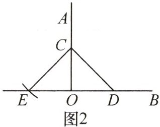 14. 有一个问题:如图 1,已知 $\angle AOB$,只用无刻度的直尺和圆规判断 $\angle AOB$ 是否为直角.小意同学的方法如下:如图 2,在 $OA$,$OB$ 上分别取点 $C$,$D$,以点 $C$ 为圆心,$CD$ 的长为半径画弧,交 $OB$ 的反向延长线于点 $E$,若测量得 $OE = OD$,则 $\angle AOB = 90^{\circ}$.小意同学判断的依据是_______.
