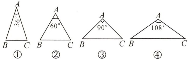 12. 如图,下列 4 个三角形中,均有 AB = AC,则经过三角形的一个顶点的一条直线能够将这个三角形分成两个小等腰三角形的是(