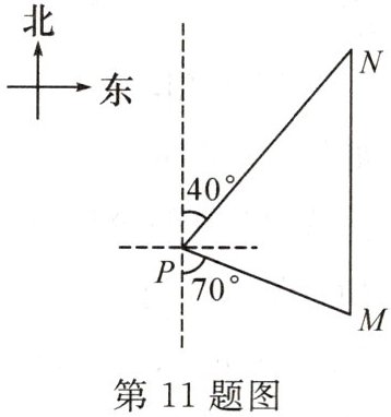 11. 北京五中校本经典题 如图,一艘海轮位于灯塔 P 的南偏东 70°方向的点 M 处,它以 40 海里/时的速度向正北方向航行,2 小时后到达位于灯塔 P 的北偏东 40°的点 N 处,则点 N 处与灯塔 P 的距离为(
