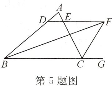 5. 如图,$\angle ABC$ 的平分线 $BF$ 与 $\triangle ABC$ 的外角 $\angle ACG$ 的平分线相交于点 $F$,过点 $F$ 作 $DF // BC$ 交 $AB$ 于点 $D$,交 $AC$ 于点 $E$。若 $BD = 7$ cm,$CE = 5$ cm,则 $DE$ 的长为