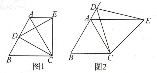 (3)如图 2,动点 $D$ 运动到边 $BA$ 的延长线上,$\triangle EDC$ 仍为等边三角形,请问是否仍有 $AE// BC$?证明你的猜想.