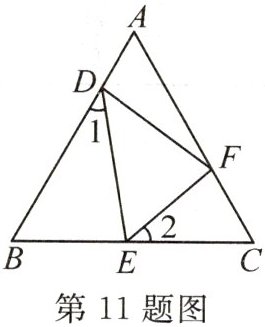 11. 如图,$\triangle ABC$ 是等边三角形,点 $D$,$E$,$F$ 分别在 $AB$,$BC$,$AC$ 上. 若 $\angle 1 = \angle 2$,$\angle DFE = 80^{\circ}$,则 $\angle EDF=$(