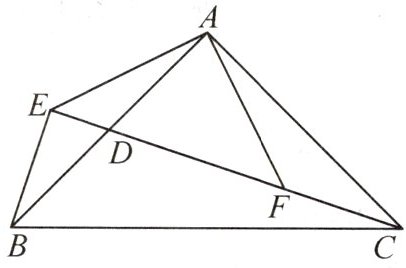 8. 如图,在$\triangle ABC$中,$\angle BAC = 90^{\circ}$,$AB = AC$,$D$是$AB$的中点,连接$CD$,过点$B$作$BE \perp CD$交$CD$的延长线于点$E$,连接$AE$,过点$A$作$AF \perp AE$交$CD$于点$F$。求证: