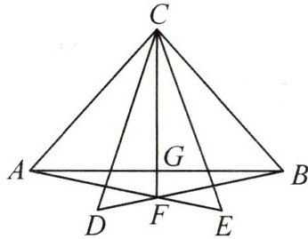 7. 北京四中校本经典题 如图,$\triangle ABC$为等腰三角形,$AC = BC$,$\triangle BDC$和$\triangle ACE$均为等边三角形,$AE$与$BD$相交于点$F$,连接$CF$交$AB$于点$G$。