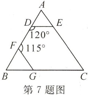 7. (2023·徐州)如图,在△ABC中,若DE//BC,FG//AC,∠BDE=120°,∠DFG=115°,则∠C=
