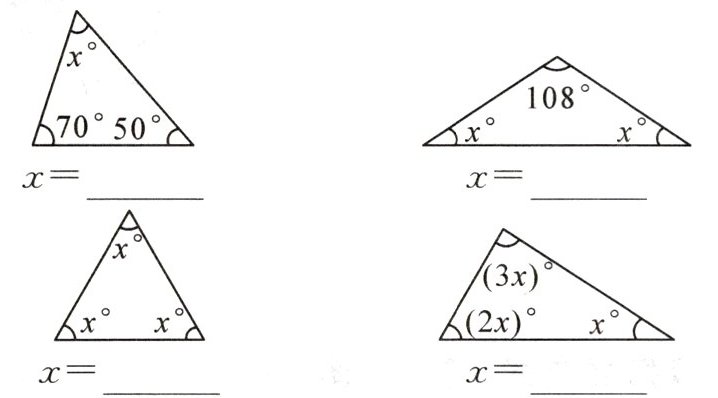 4. (教材P16习题T3变式)在△ABC中,∠B比∠A大20°,∠C比∠B大20°. 求△ABC的各内角的度数.