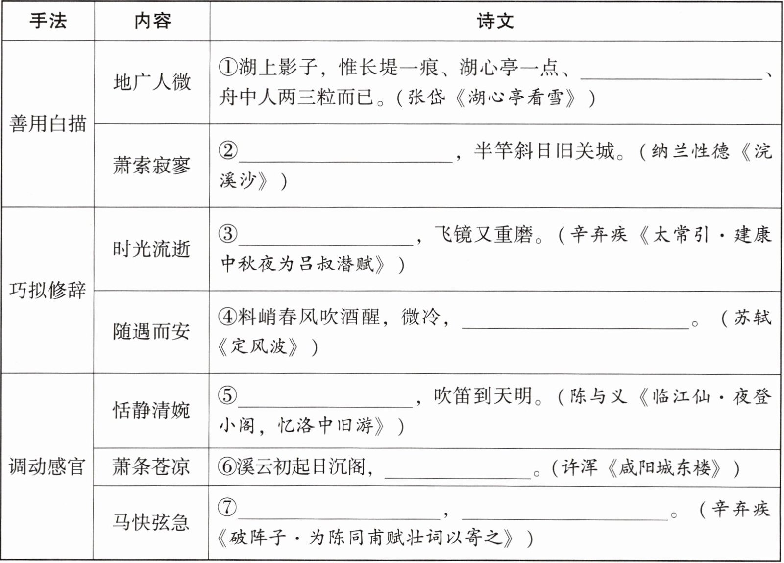 2. 小深在阅读中国古典文学作品时,发现其描写环境的手法值得借鉴,便做了归纳总结,请你帮助他完善相关内容。